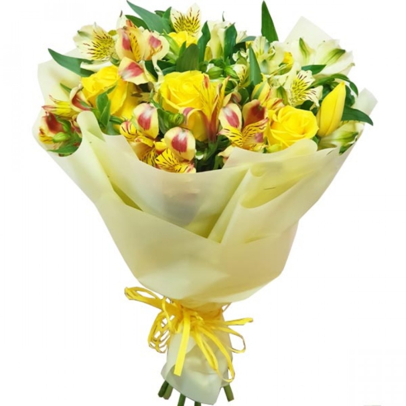 Букет состоит из 5 желтых роз, 5 желтых тюльпанов, 5 желтых альстромерий, красивая упаковка, атласная лента.