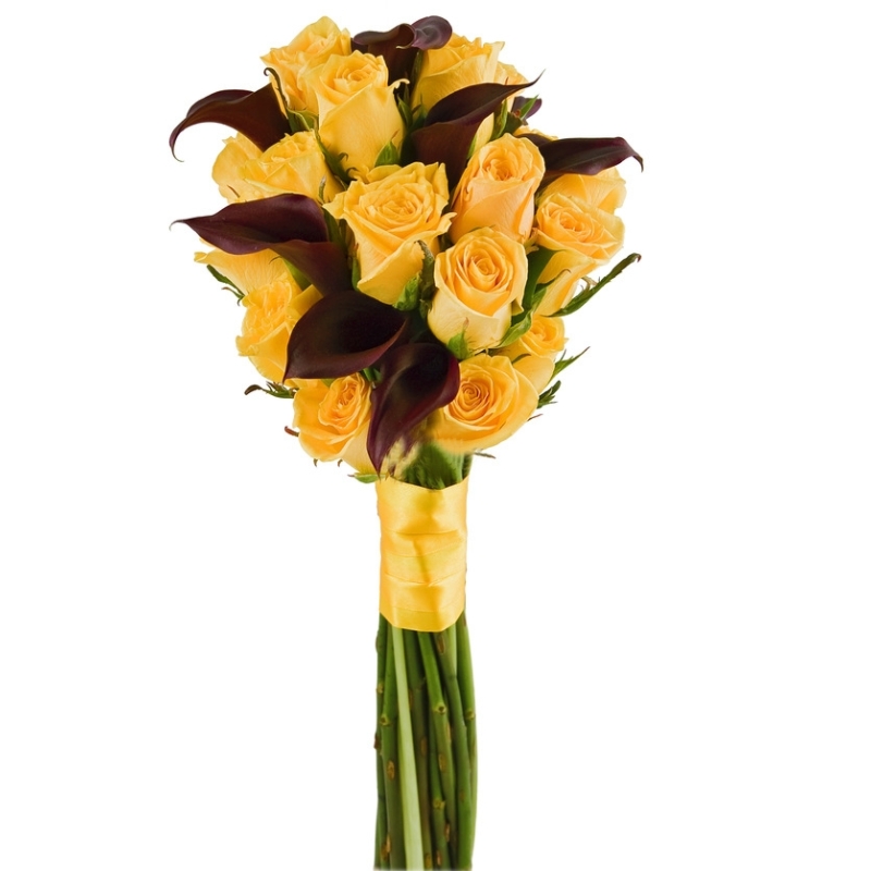 Букет состоит из 17 желтых роз, 10 бордовых калл, прозрачная упаковка, атласная лента.